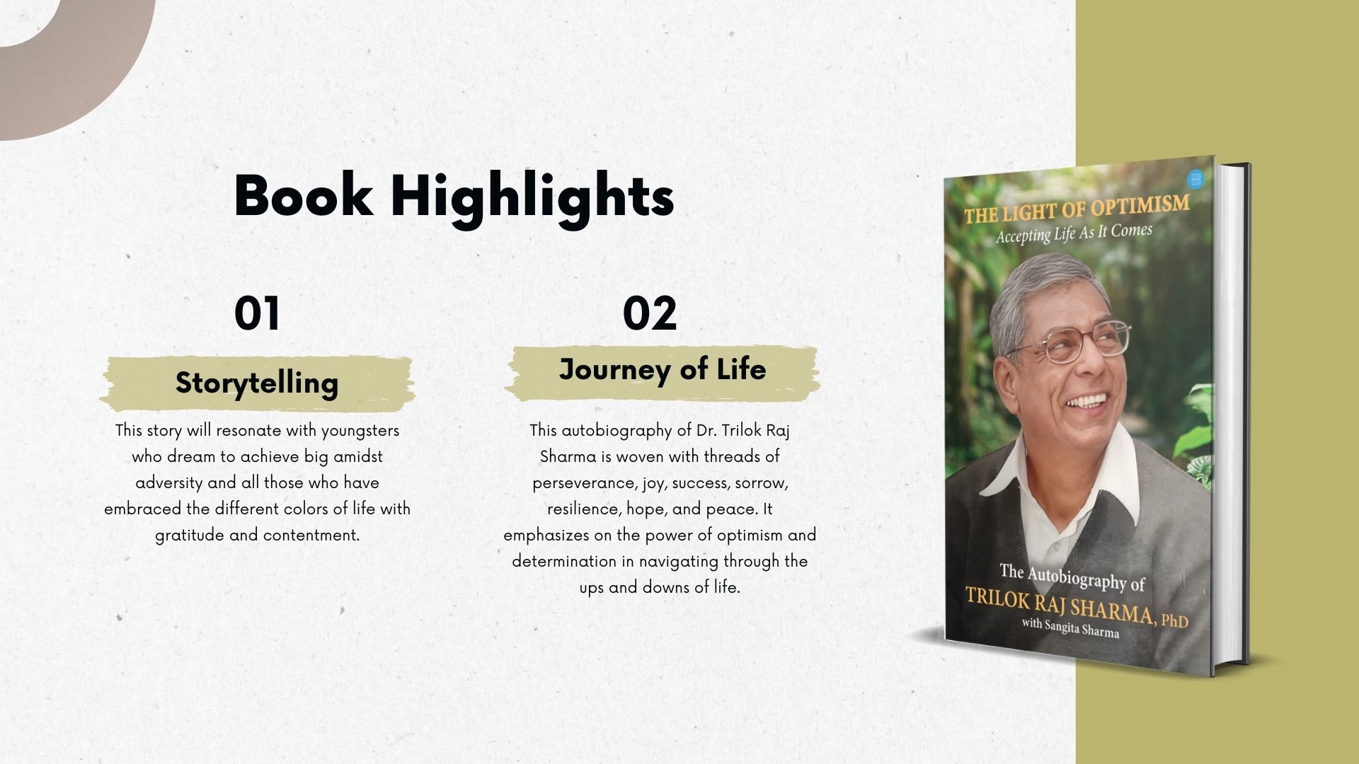 This autobiography of Dr. Trilok Raj Sharma is woven with threads of perseverance, joy, success, sorrow, resilience, hope, and peace. It emphasizes on the power of optimism and determination in navigating through the ups and downs of life.
